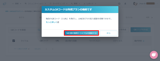 To bring up the "LINE Login" menu, please access "TOP > Connections > LINE Official Accounts > Select LINE Official Account > QR Code" and click "Start 14-day free trial".