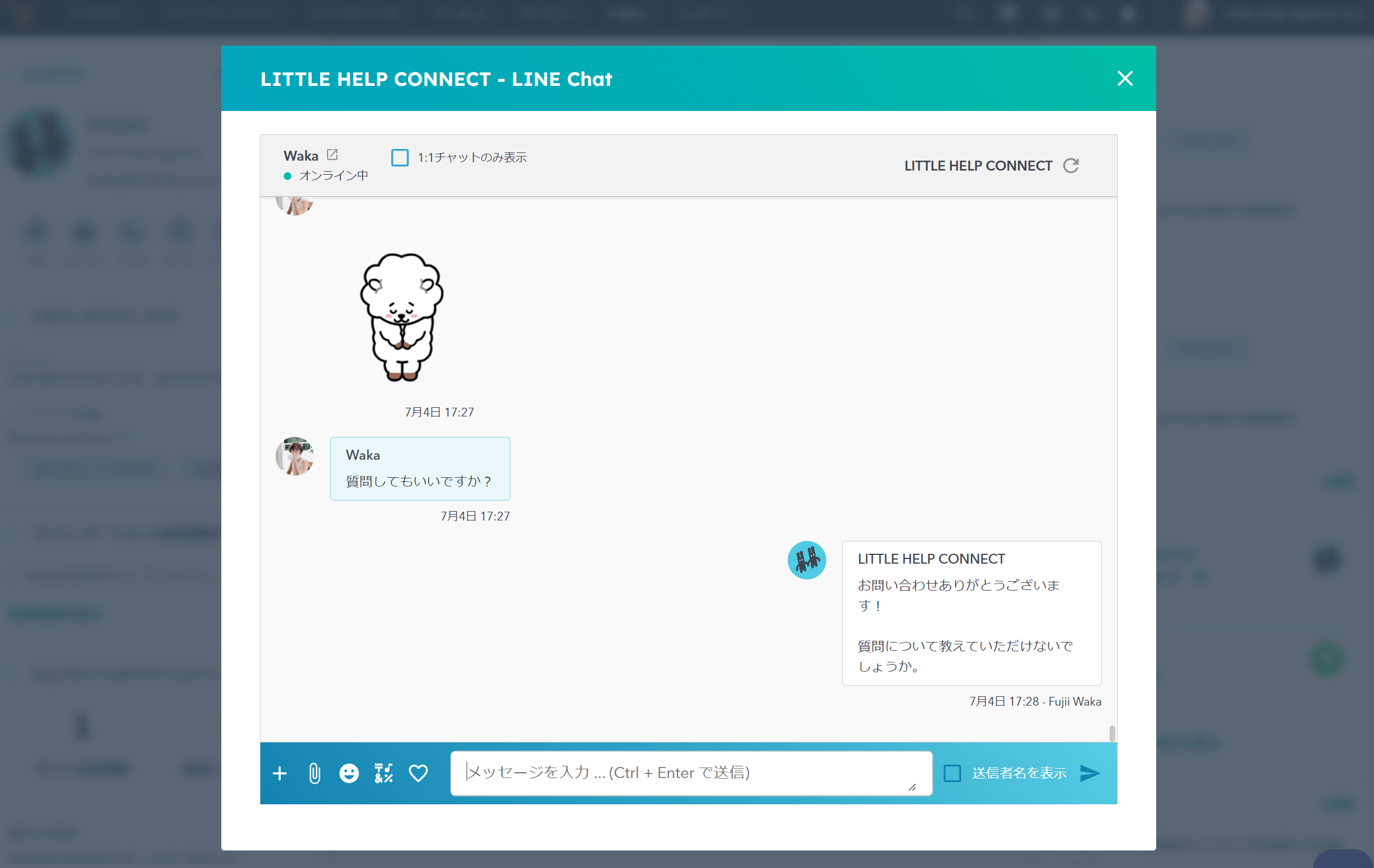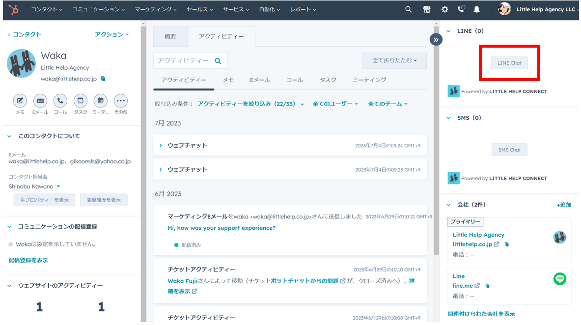 LINEの有人チャット対応は、LITTLE HELP CONNECTの受信トレイで行うことができる他、HubSpotのコンタクトレコード上でも行うことができます。