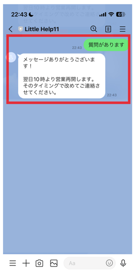 例えば、友だちから連絡をもらっても有人対応できる営業時間や期間等が決まっている場合、「営業時間外」であることを自動応答機能で友だちに知らせることができます。