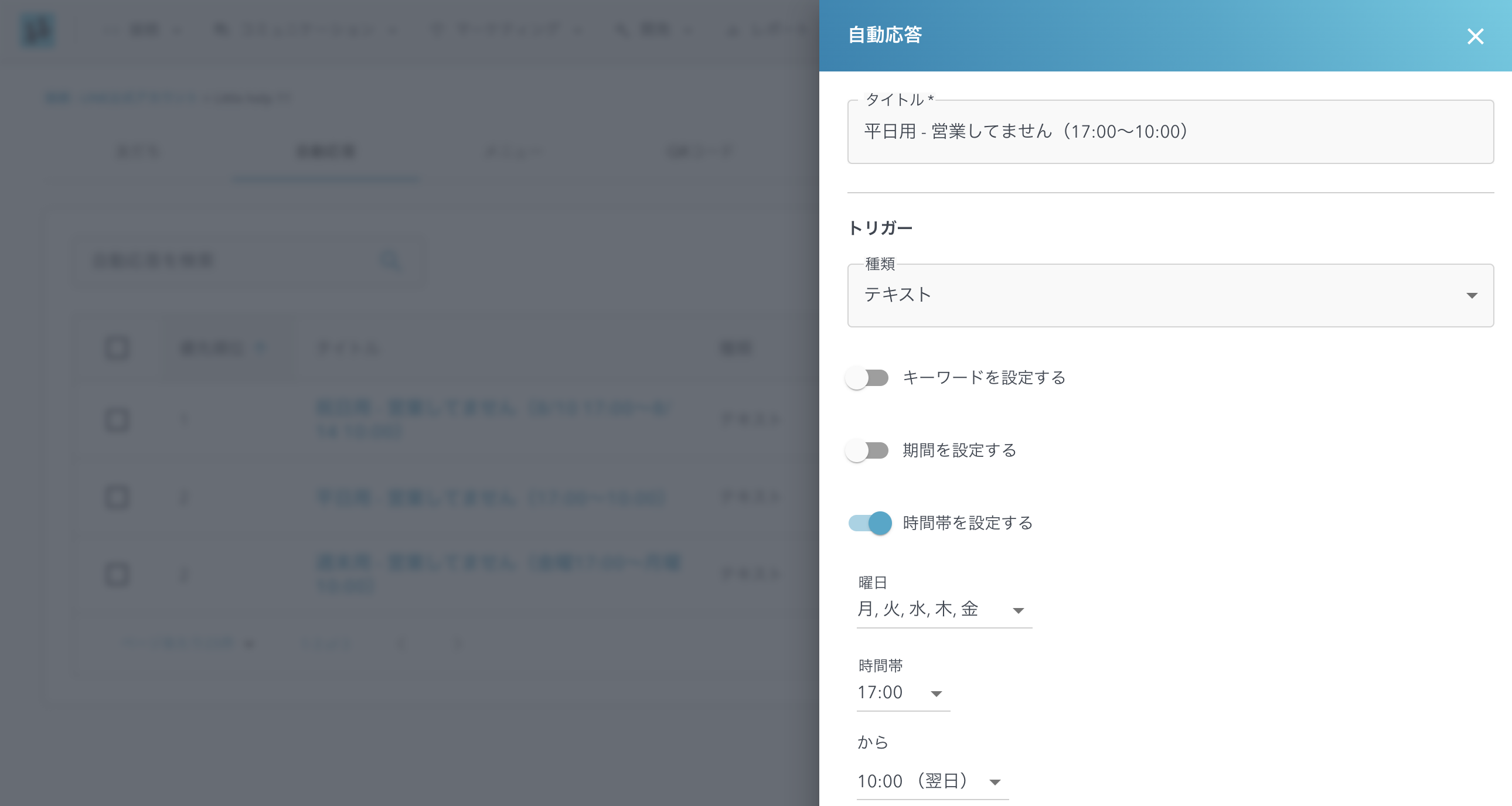 - 自動応答を動かす曜日、時間帯を設定できる項目です。本項目はデフォルトはOFFです。