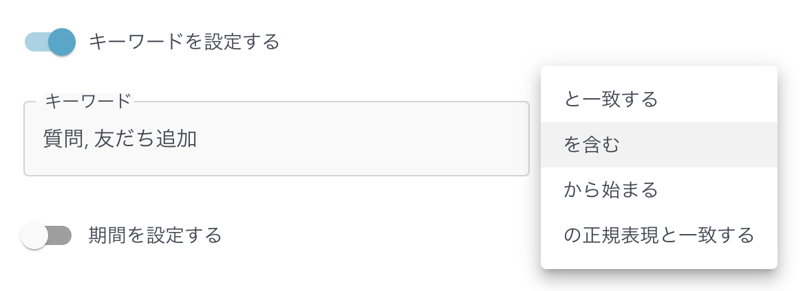 - 種類で「テキスト」を選択した場合、設定できる項目です。本項目はデフォルトではOFFです。ONにすると、キーワードの入力項目ができてきます。キーワードはカンマで区切ることで複数個設定することができます。