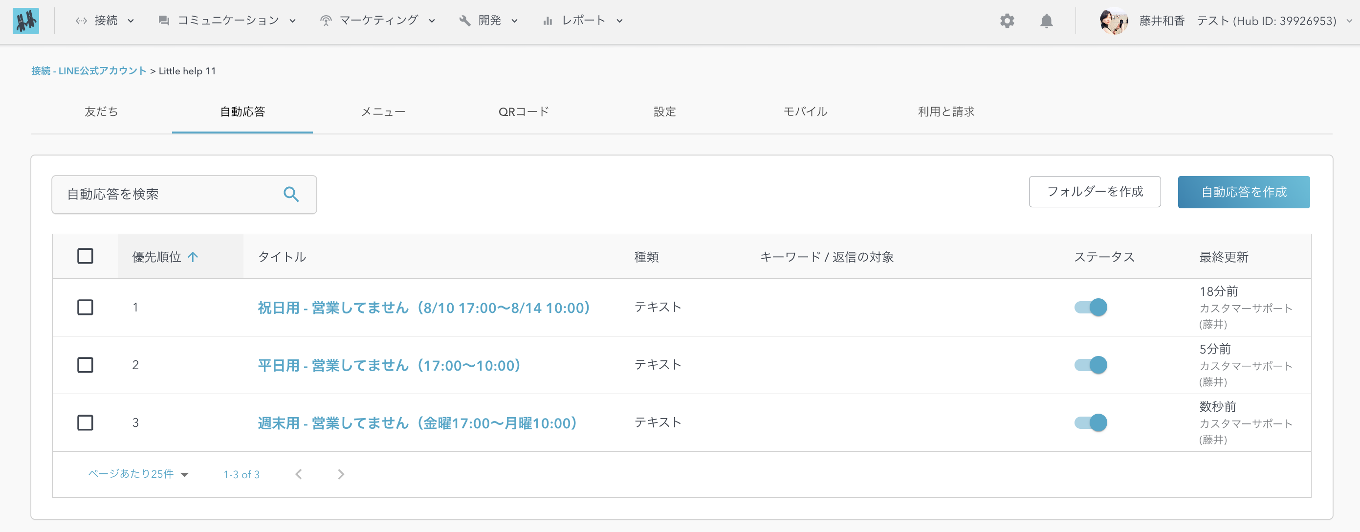 - 例えば、以下のように3つの自動応答が設定されていた時、8/1の土曜日に友だちからメッセージを受信したとします。