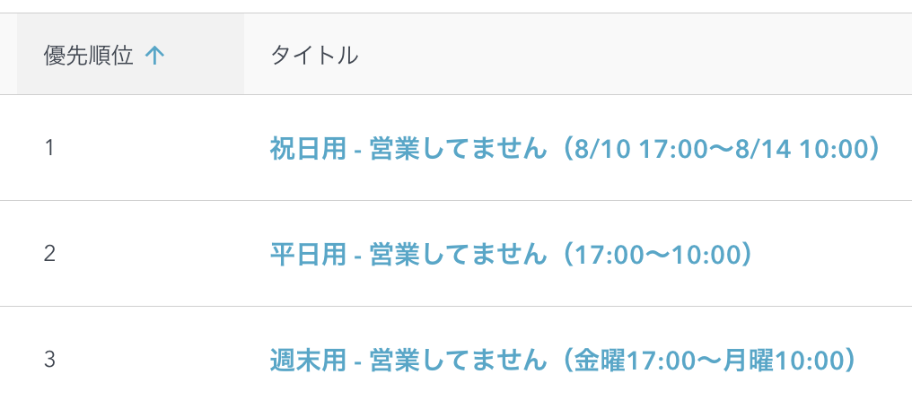 最初に「優先順位:1」の自動応答が動作しますが、メッセージ受信した日付がトリガーの期間(8/10 - 8/14)ではないので結果的に自動応答は送りません。次に「優先順位:2」の自動応答が動作しますが、こちらもメッセージ受信した曜日がトリガーの曜日(月〜金)ではないので自動応答は送りません。最後に、「優先順位:3」の自動応答が動作します。これはメッセージ受信した曜日とトリガーの曜日(金〜月)が一致するので自動応答が送られ、自動応答の処理は終了します。