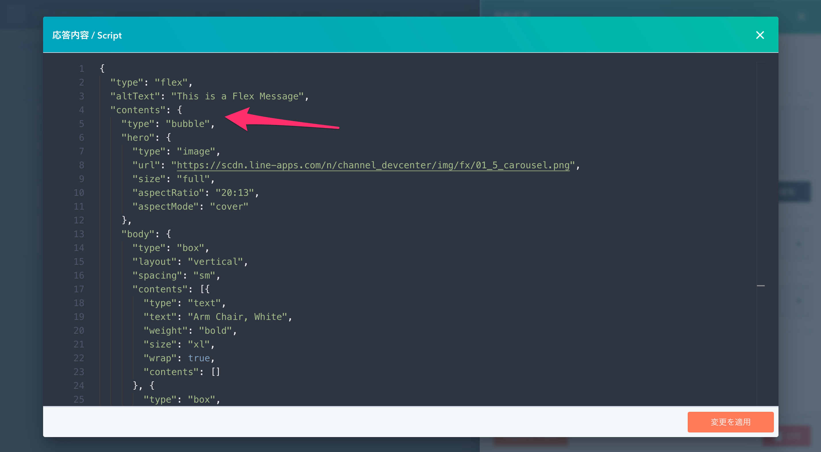 ただ、Flexメッセージの場合は生成されるJSONコードをそのままコピーしても動作しません。一部の情報が欠落しており、下記のJSONコードの「contents」キーにコピーして利用する必要があります。
