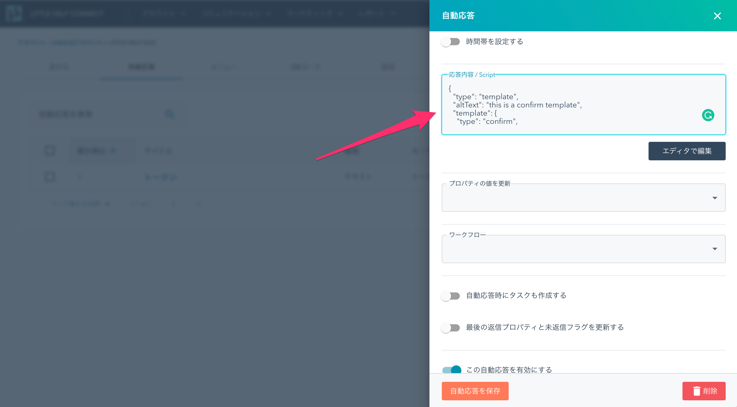 コピーしたJSONコードはHubSpotのワークフローの「LINEメッセージを送信」アクションやLITTLE HELP CONNECTのメッセージ配信の「JSON」、自動応答で利用できます。