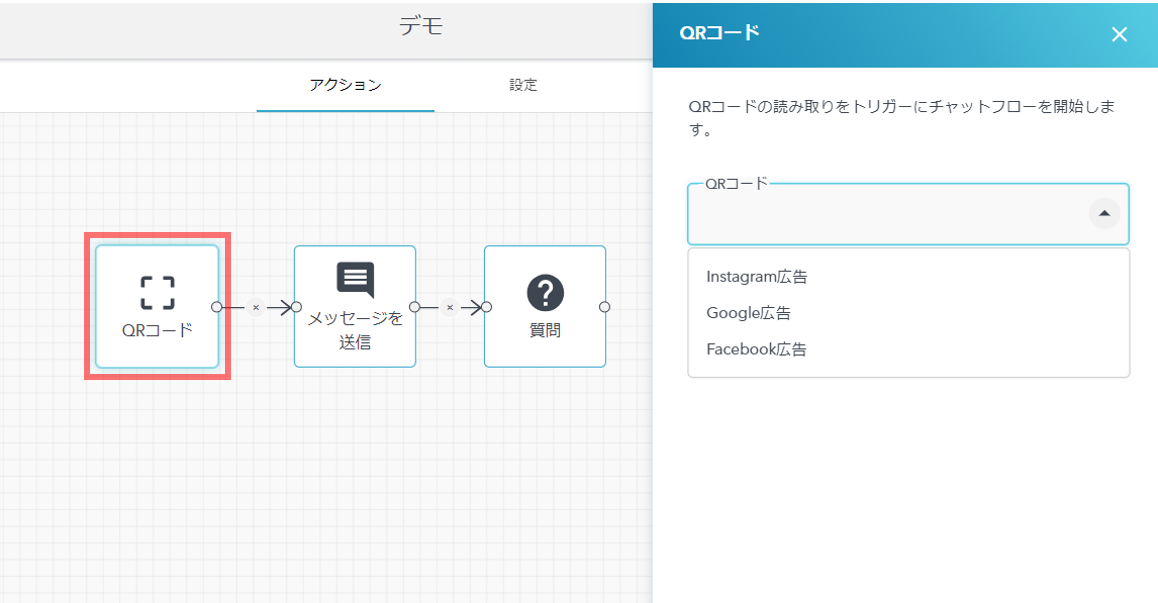 - 友だちがQRコードを読み込んだ際に発動するトリガーです。ここでのQRコードとは、LITTLE HELP CONNECTで作られたカスタムQRコードを指します。LINE純正の友だち追加QRコードをここで選択することはできません。