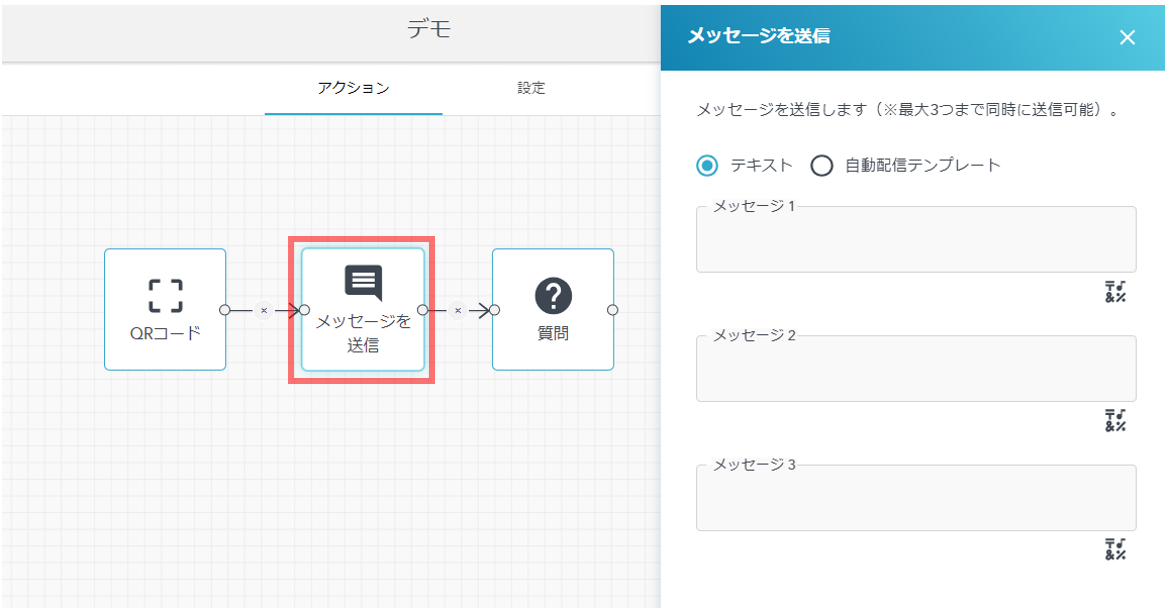 - LINEメッセージを送信できるアクションです。送信するメッセージは、チャットフローから編集するか、事前に作成した自動配信タイプのメッセージを選択することができます。