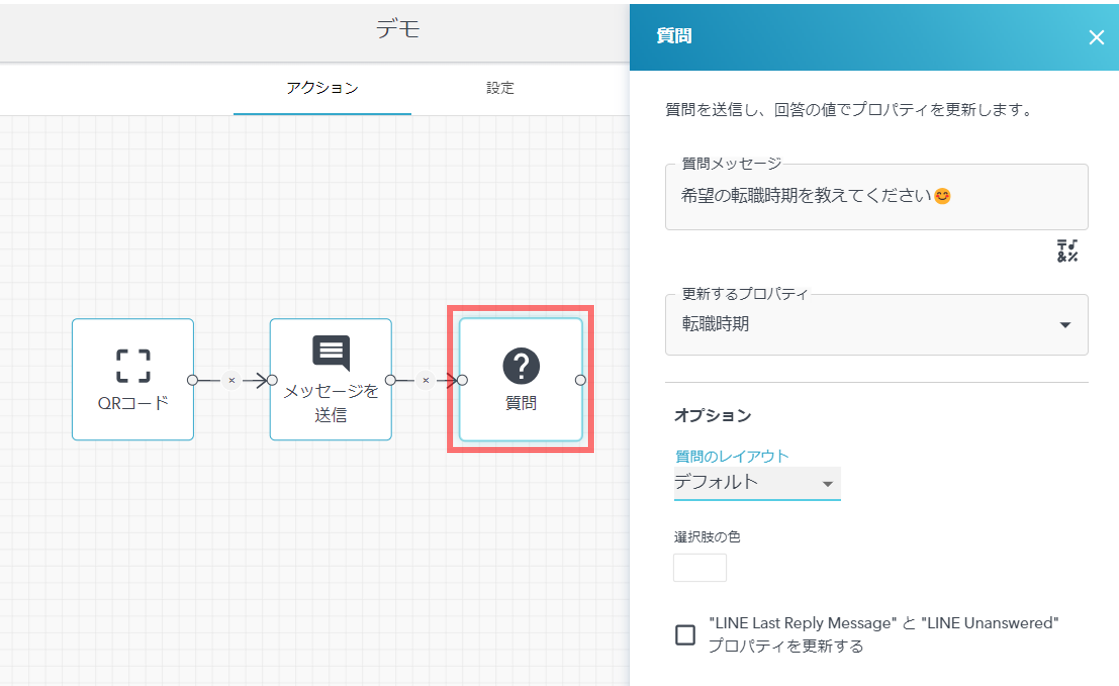 - LINEメッセージで質問を送信できるアクションです。質問後、友だちが回答した内容は、任意のHubSpotプロパティに反映されます。