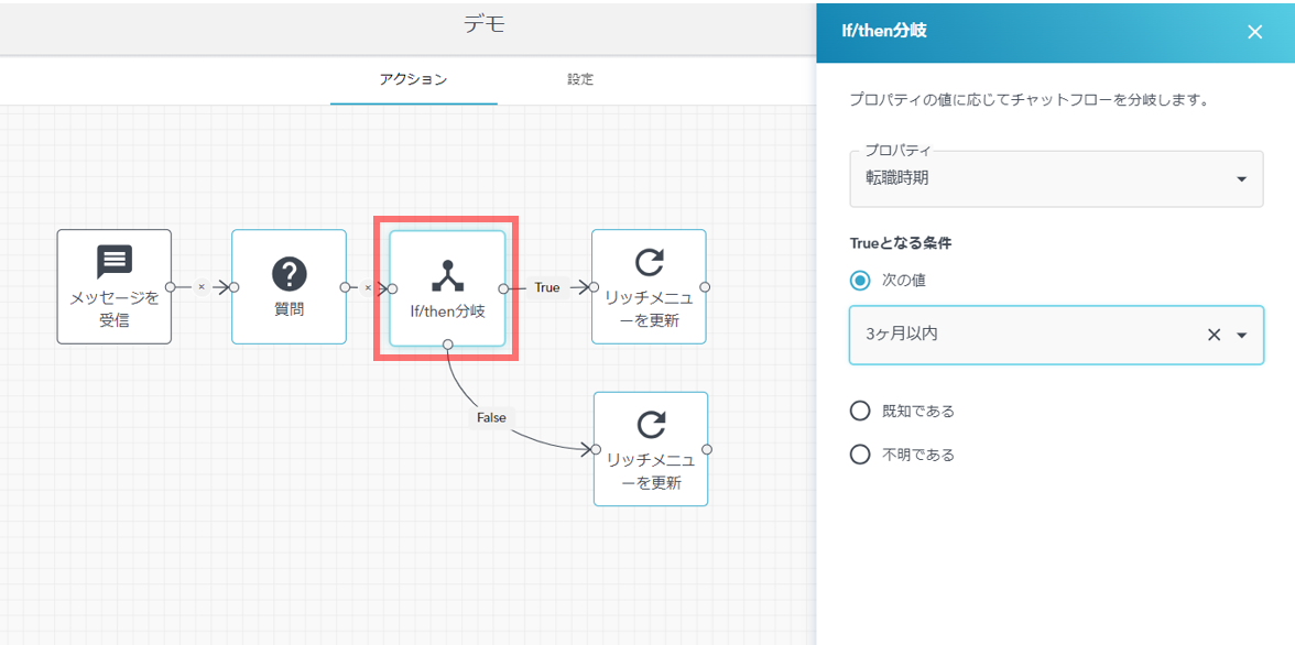- HubSpot上のプロパティの内容によりif/then分岐を作れるアクションです。いずれの「プロパティ」を選択しても、Trueとなる条件のオプションは変わりません。