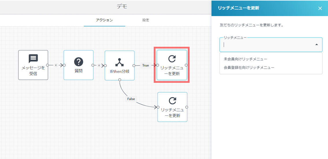 - 友だちのリッチメニューを更新できるアクションです。LITTLE HELP CONNECTのスマートリッチメニューに登録されたリッチメニューを選択することができます。