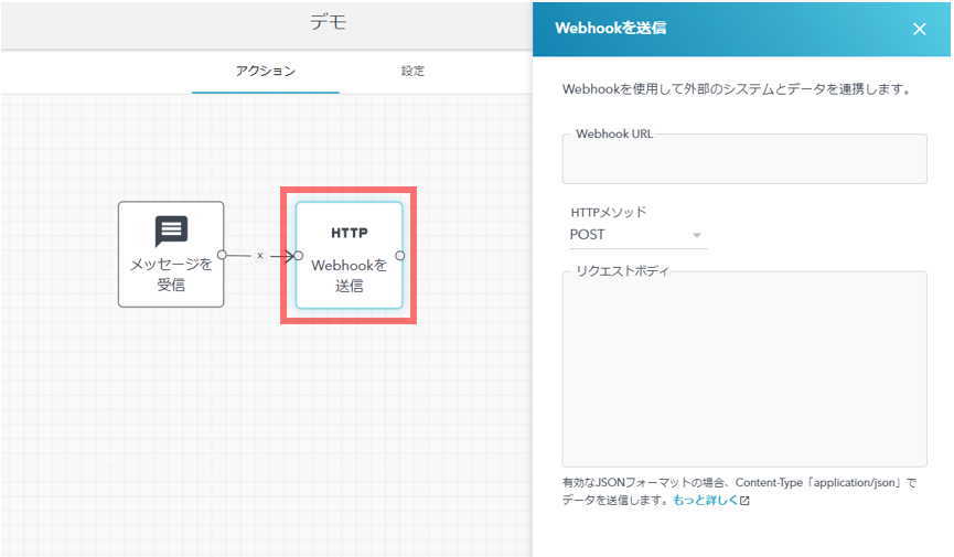- 外部システムにデータを送信するアクションです。Google Chatへの通知や自社システムとのデータ連携の用途でご利用いただけます。
