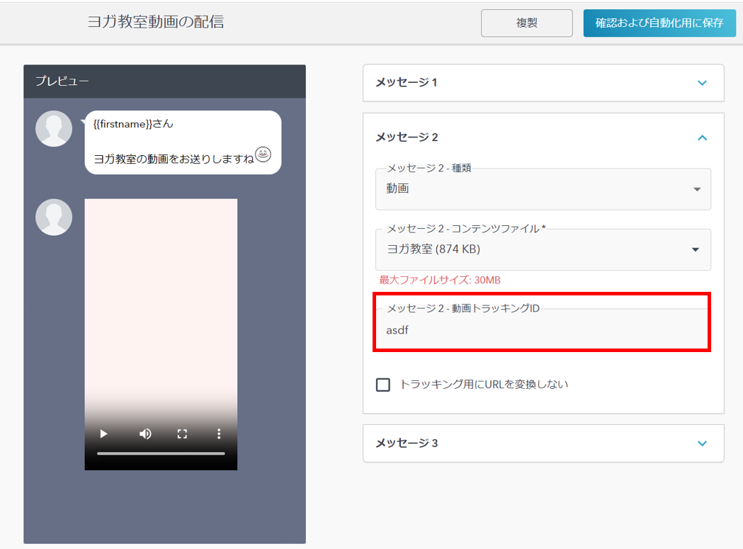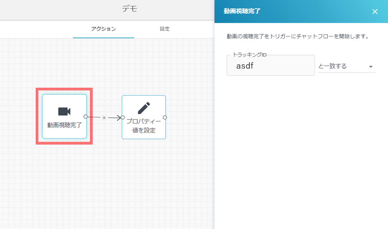 - 動画メッセージで送信した動画の視聴を完了した場合に発動するトリガーです。対象の動画はメッセージ配信で設定した「トラッキングID」を指定します。