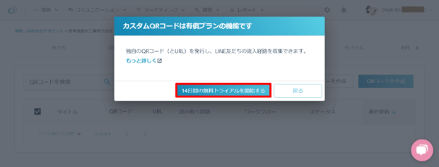 「LINEログイン」のメニューを出すには、「TOP>接続>LINE公式アカウント>LINE公式アカウント選択>QRコード」にアクセスいただき、「14日間の無料トライアルを開始する」をクリックしてください。