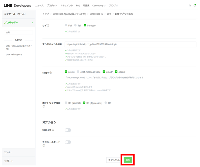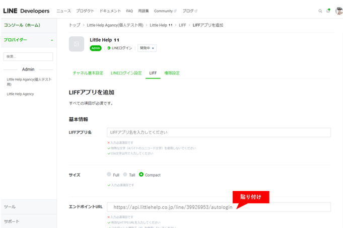LIFFエンドポイントURLは、LITTLE HELP CONNECTにある値を貼り付けます。