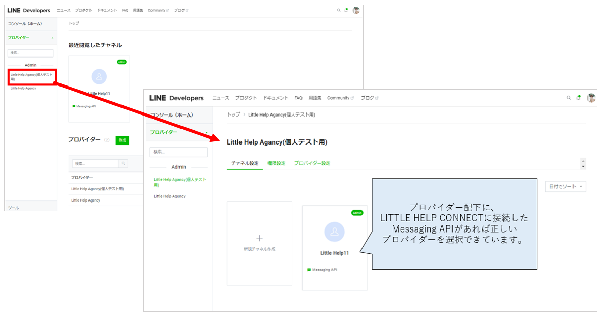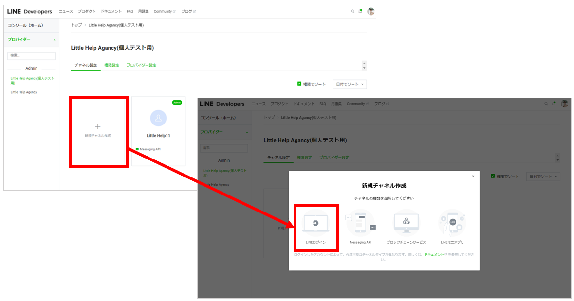 必ず同一のプロバイダー配下に、Messaging APIとLINEログインを作成してください。