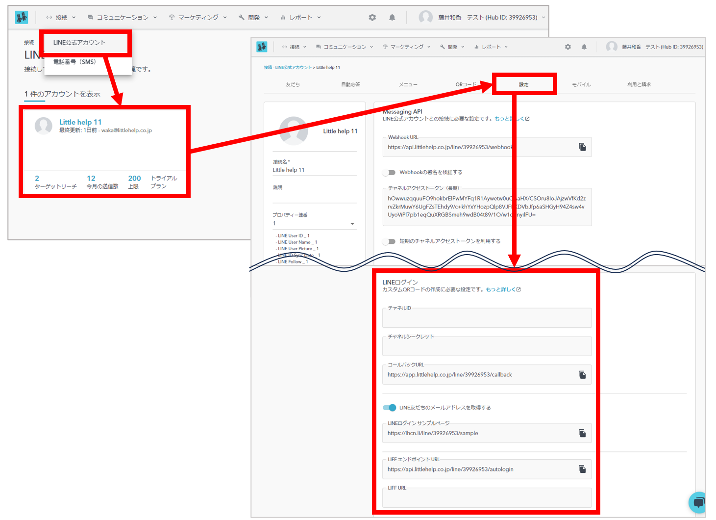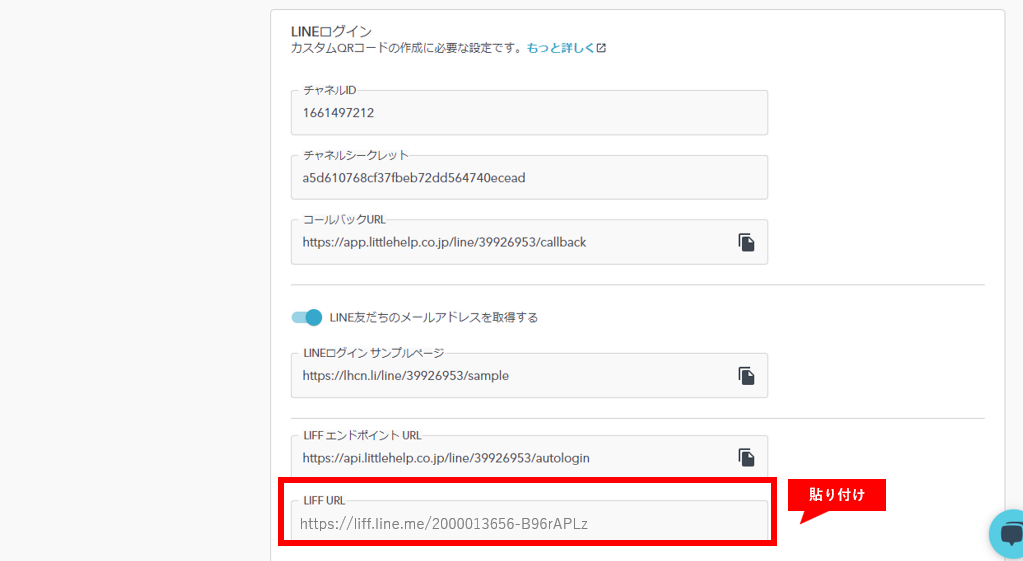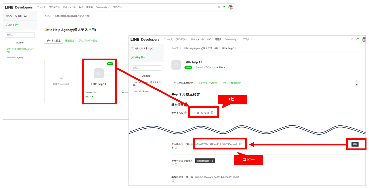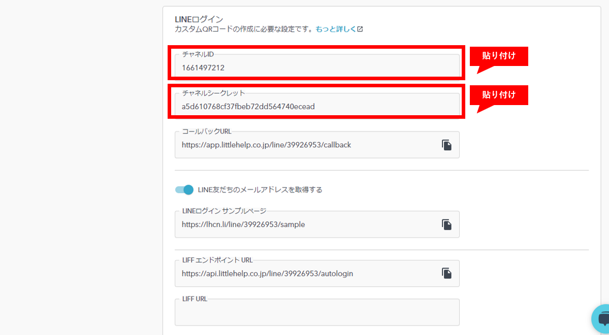 LITTLE HELP CONNECTの「チャネルID」「チャネルシークレット」に貼り付けてください。