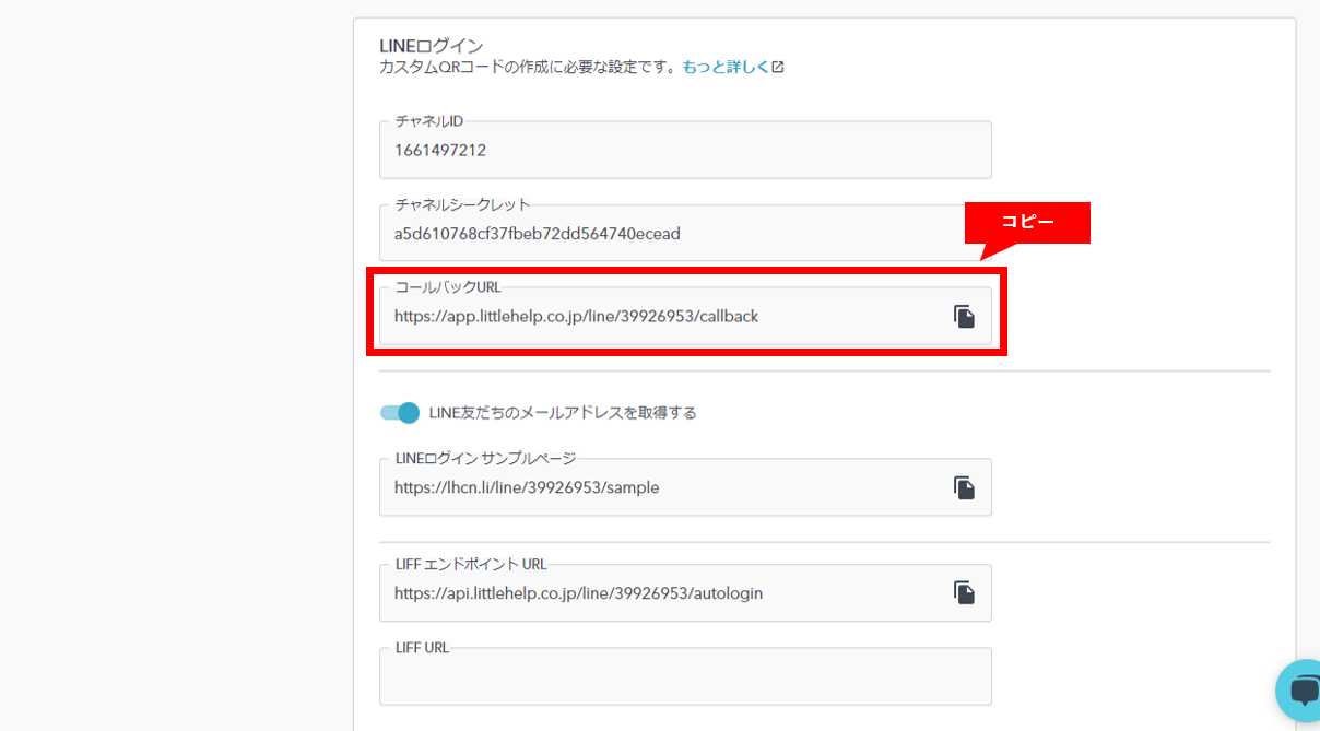 次に、LITTLE HELP CONNECT管理画面上の「コールバックURL」をコピーして