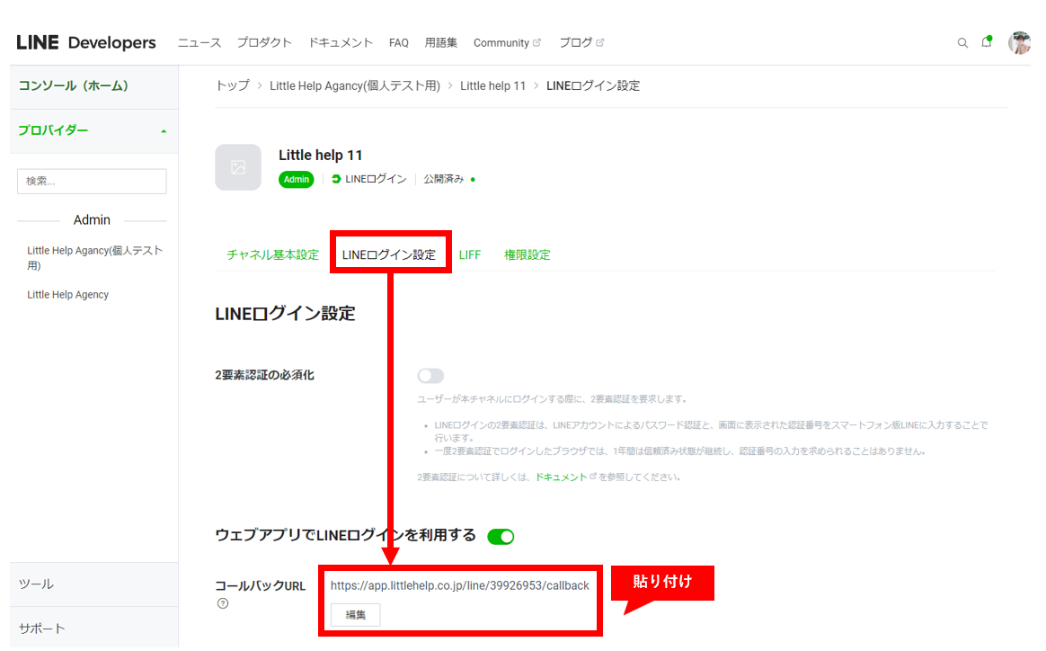 LINE Developersの「LINEログイン設定>コールバックURL」に貼り付けます。