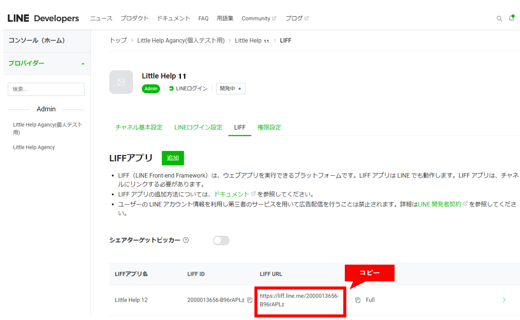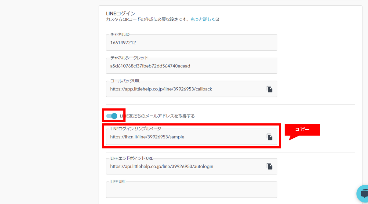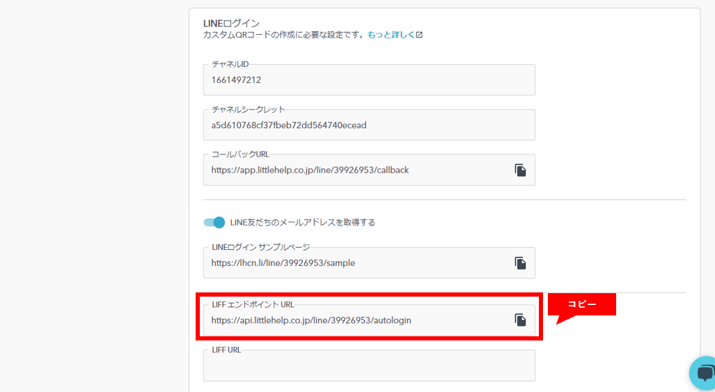 LITTLE HELP CONNECTから「LIFFエンドポイントURL」をコピーし