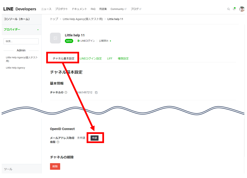 「チャネル基本設定」を選択し、「メールアドレス取得権限」で「申請」ボタンをクリックします。