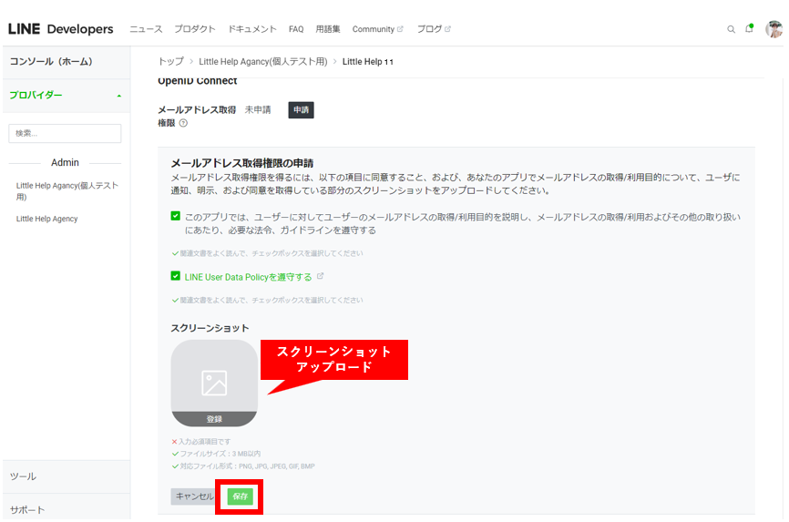 規約を遵守する旨にチェックを入れ、取得した「LINEログイン サンプルページ」のスクリーンショットをアップロードし保存します。