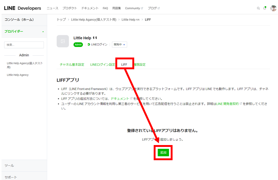 LINEログインの「LIFF」タブに移動し、「追加」をクリックします。