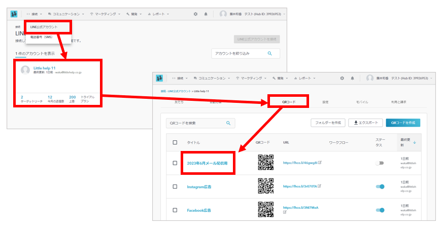 LITTLE HELP CONNECTの管理画面にアクセスし、今回使用するQRコードの設定画面を開き「URL」の値をコピーします。