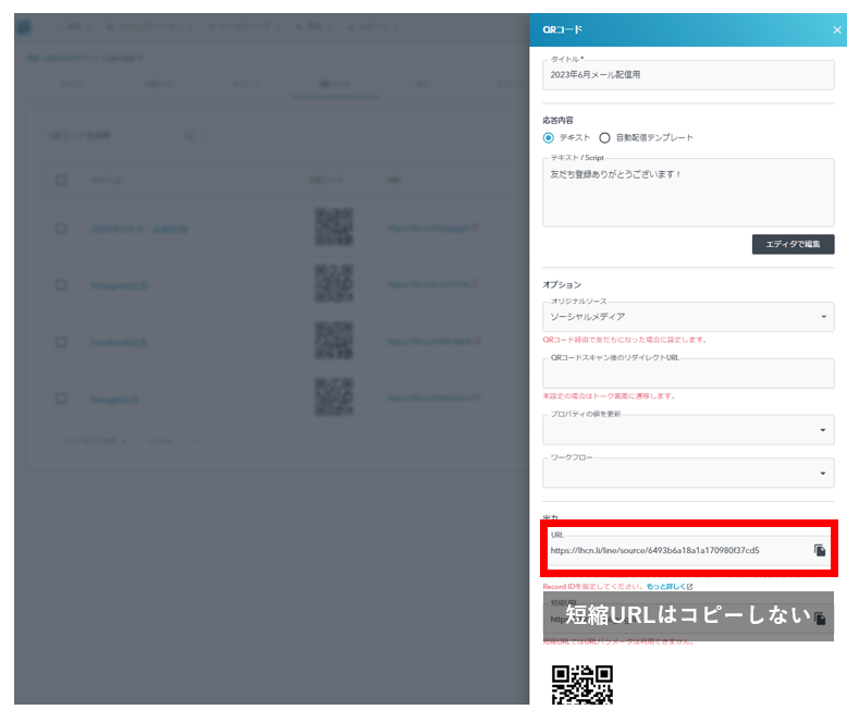 QRコードの短縮URLでは、パラメータの付与が機能しなくなりマージ処理ができなくなります。必ずQRコードのURLは、短縮URLではなく通常のURLを使用してください。