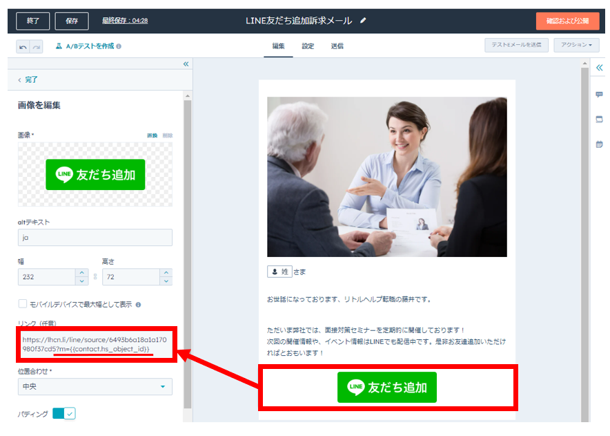 URLをコピーしたら、HubSpotのマーケティングEメール作成画面にもどり、ボタンの飛び先URLとして設定します。その際、必ずURLの末尾には「?m={{contact.hs_object_id}}」を記載してください。