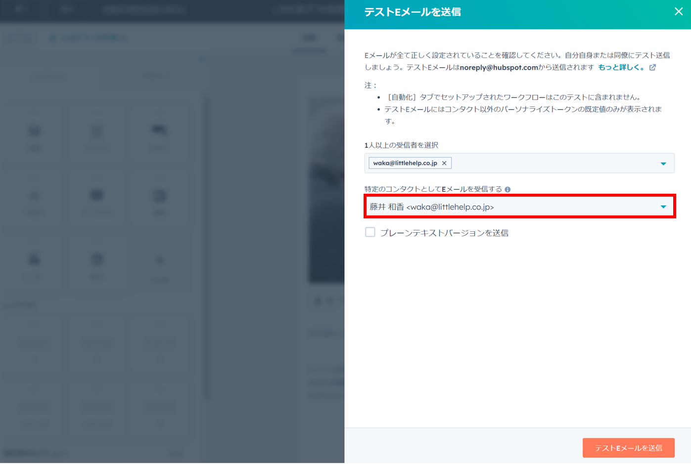 テストEメールを送る場合、必ず「特定のコンタクトとしてEメールを受信する」機能を利用してください。