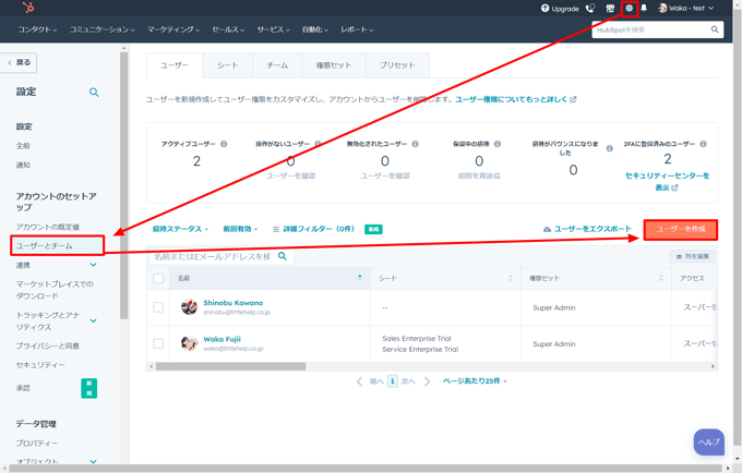 HubSpotの「TOP>設定>ユーザーとチーム>ユーザーを作成」にアクセスします。