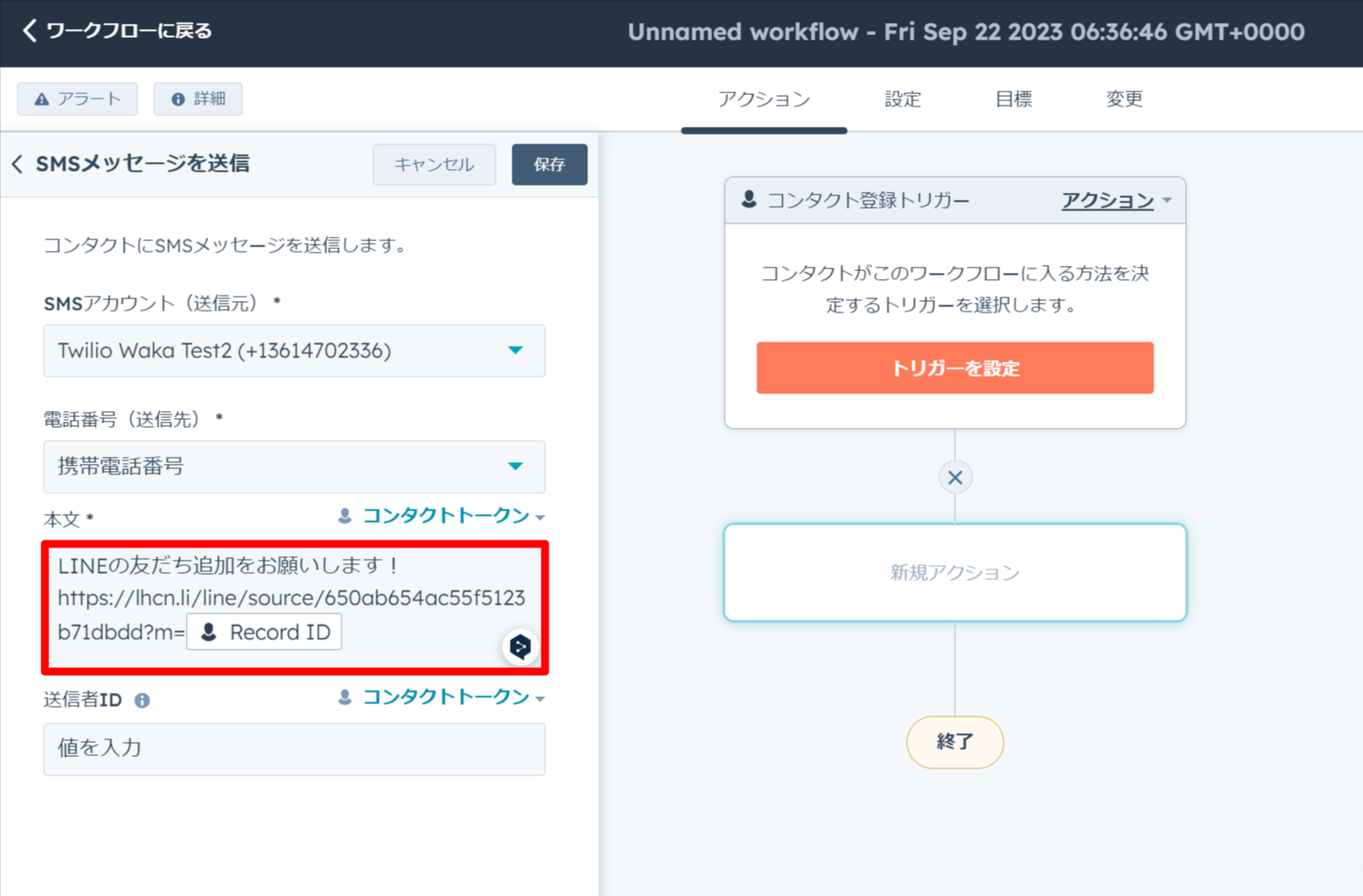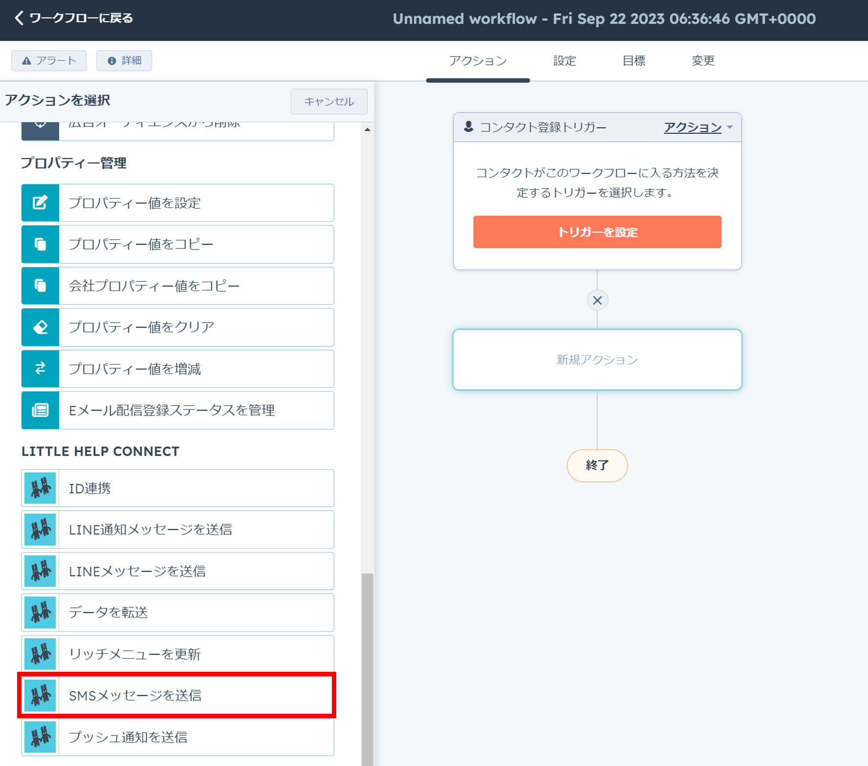 コンタクトベースのワークフローの編集画面にアクセスし、アクション「SMSメッセージを送信」を選択します。