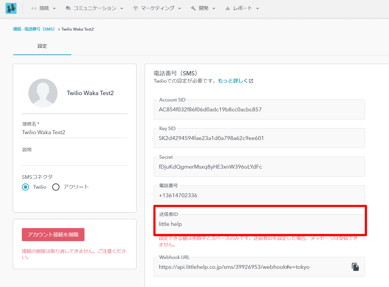 - SMSの契約をTwilioでしている場合、「送信者ID」を設定することができます。