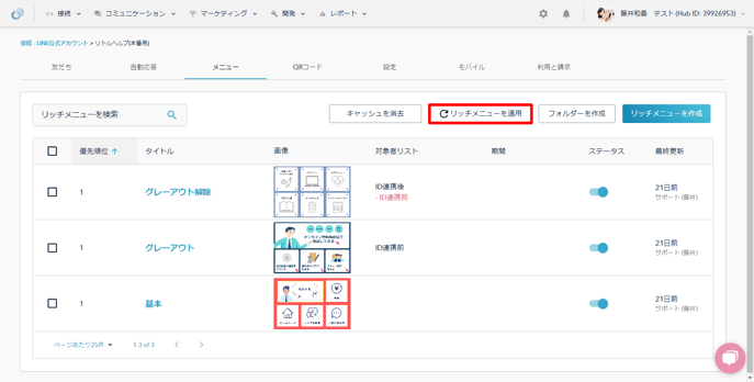 LITTLE HELP CONNECTのスマートリッチメニューの設定をすぐに友だちに反映したい場合、「リッチメニューを適用」ボタンを押しましょう。