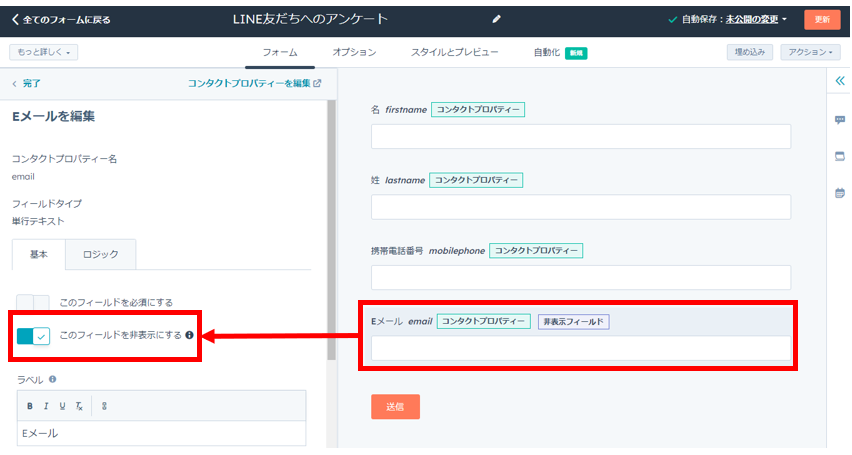 フォームには、友だちに質問したい項目に追加して、必ずコンタクトプロパティ「Eメール」を非表示にして挿入してください。フォームが作成できたら公開します。