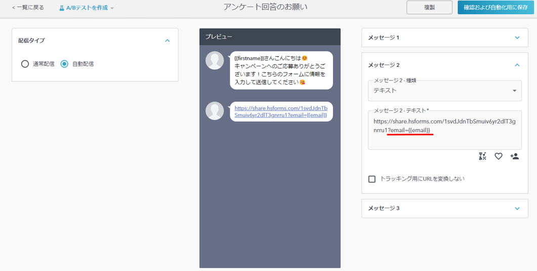 メッセージにはHubSpotで作成・公開したフォームのURL挿入してください。フォームのURLを挿入する際は、必ずURLの末尾にパラメータ「?email={{email}}」を付与してください。
