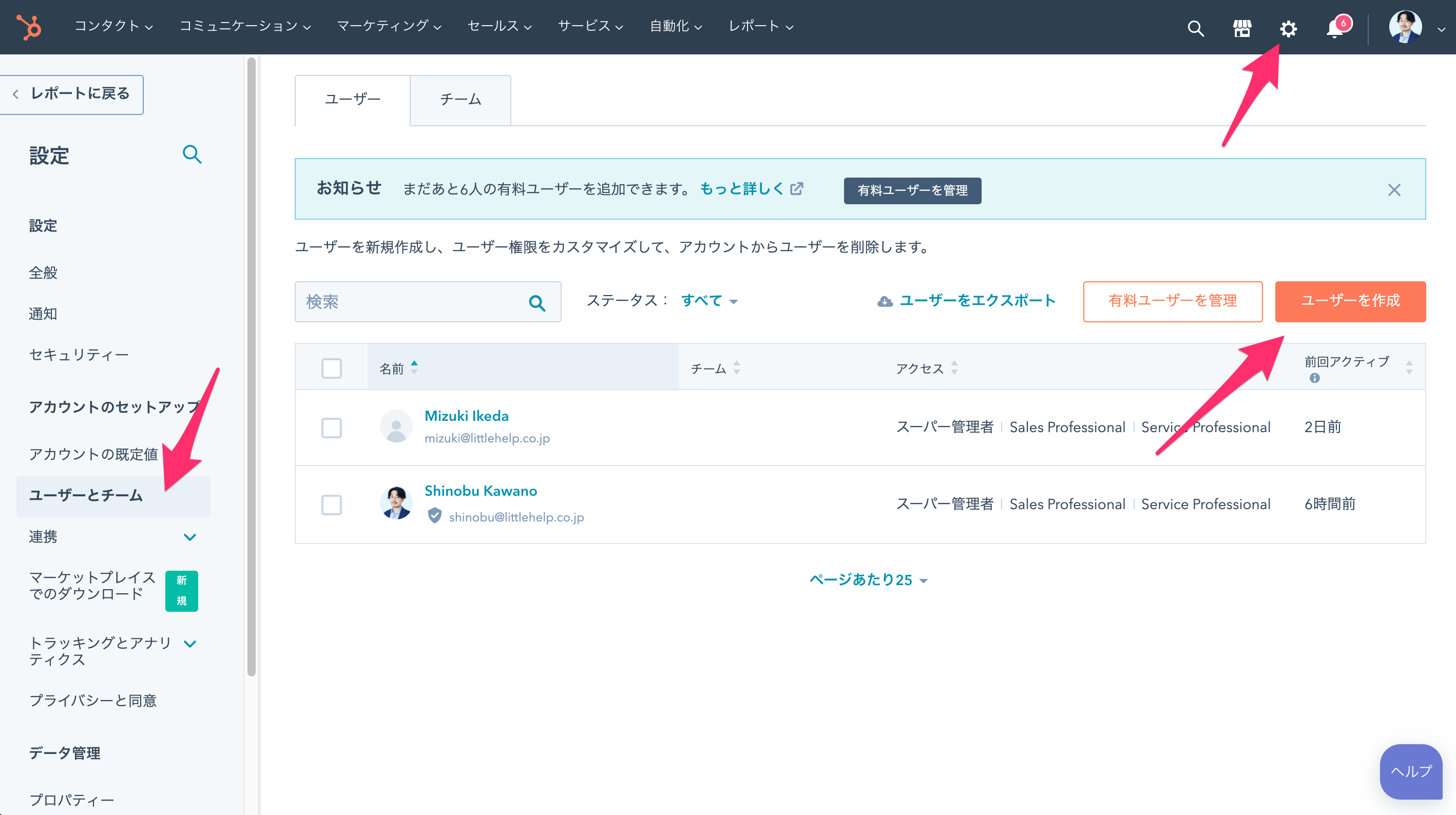 1. HubSpotの設定画面から「ユーザーとチーム」を選択します。その後「ユーザーを作成」ボタンをクリックしてください。