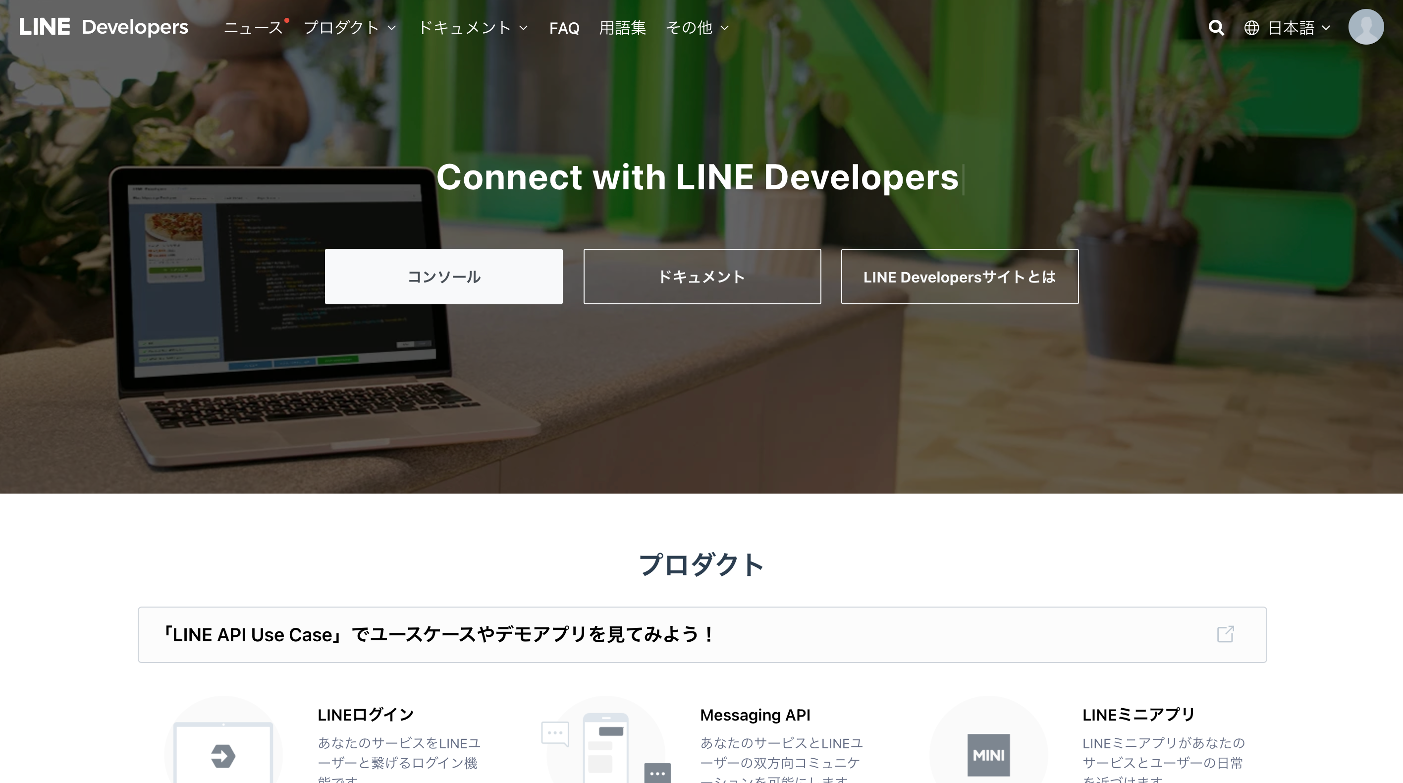 LINE Developersサイトは開発者向けのポータルサイトです。LINEのさまざまな開発者向けプロダクトを利用するための、管理ツールやドキュメントを利用できます。