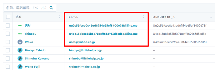 - LINE友だちが、LINEアカウントにメールアドレスを登録していない。もしくは、登録はしているがLINE公式カウントにメールアドレス提供の許可をしなかった場合、「Eメール」にはLITTLE HELP CONNECTが任意で作成したメールアドレスがダミーデータとして保存されます。(例:@line.me)