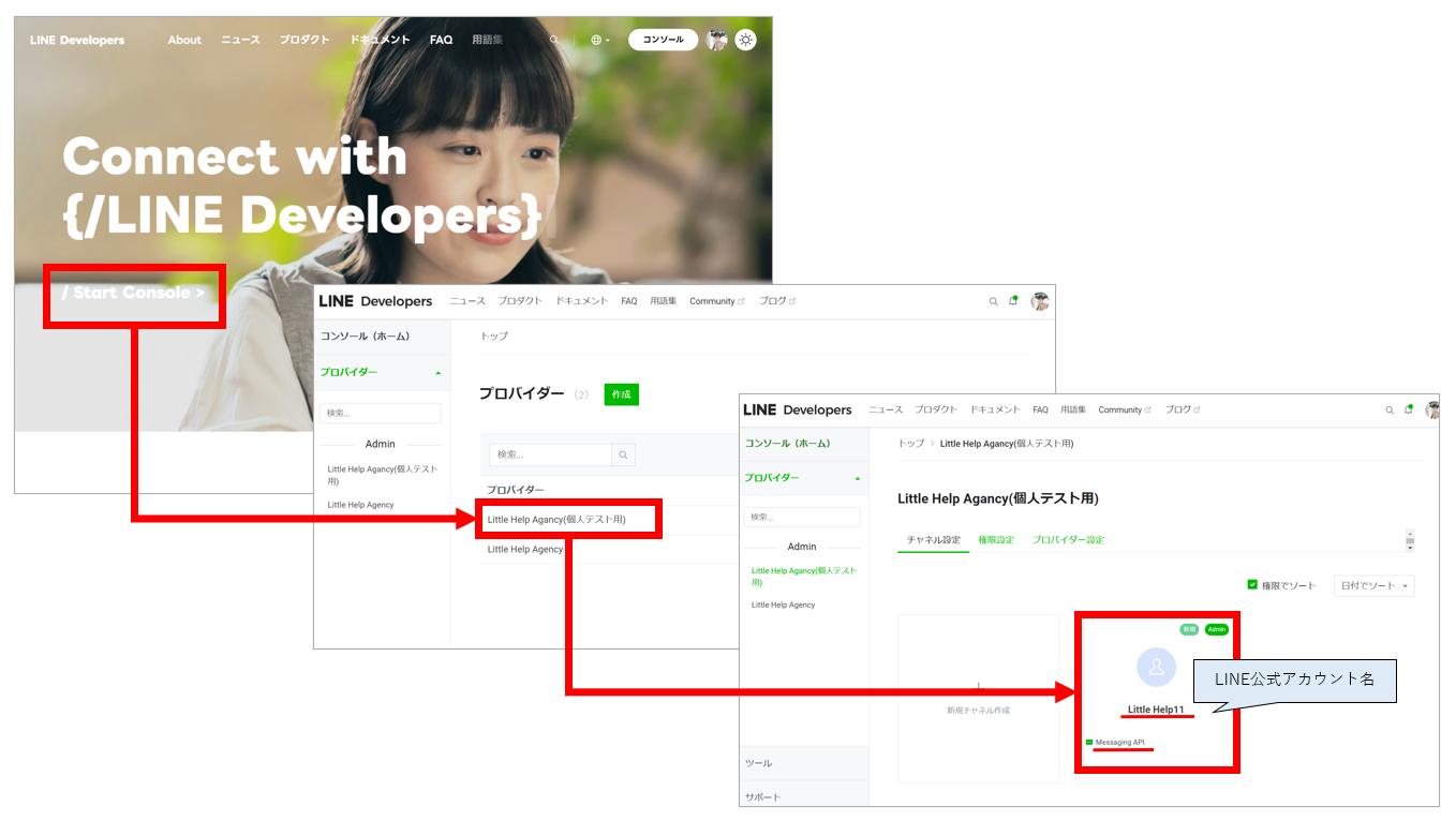 上記を踏まえても接続先が不明である場合、誤ったLINE Developersのアカウントを利用している可能性があります。一度LINE Developersからログアウトし、別のアカウントでLINE Developersにログインし直して、改めてMessaging APIが存在するか確認してください。
