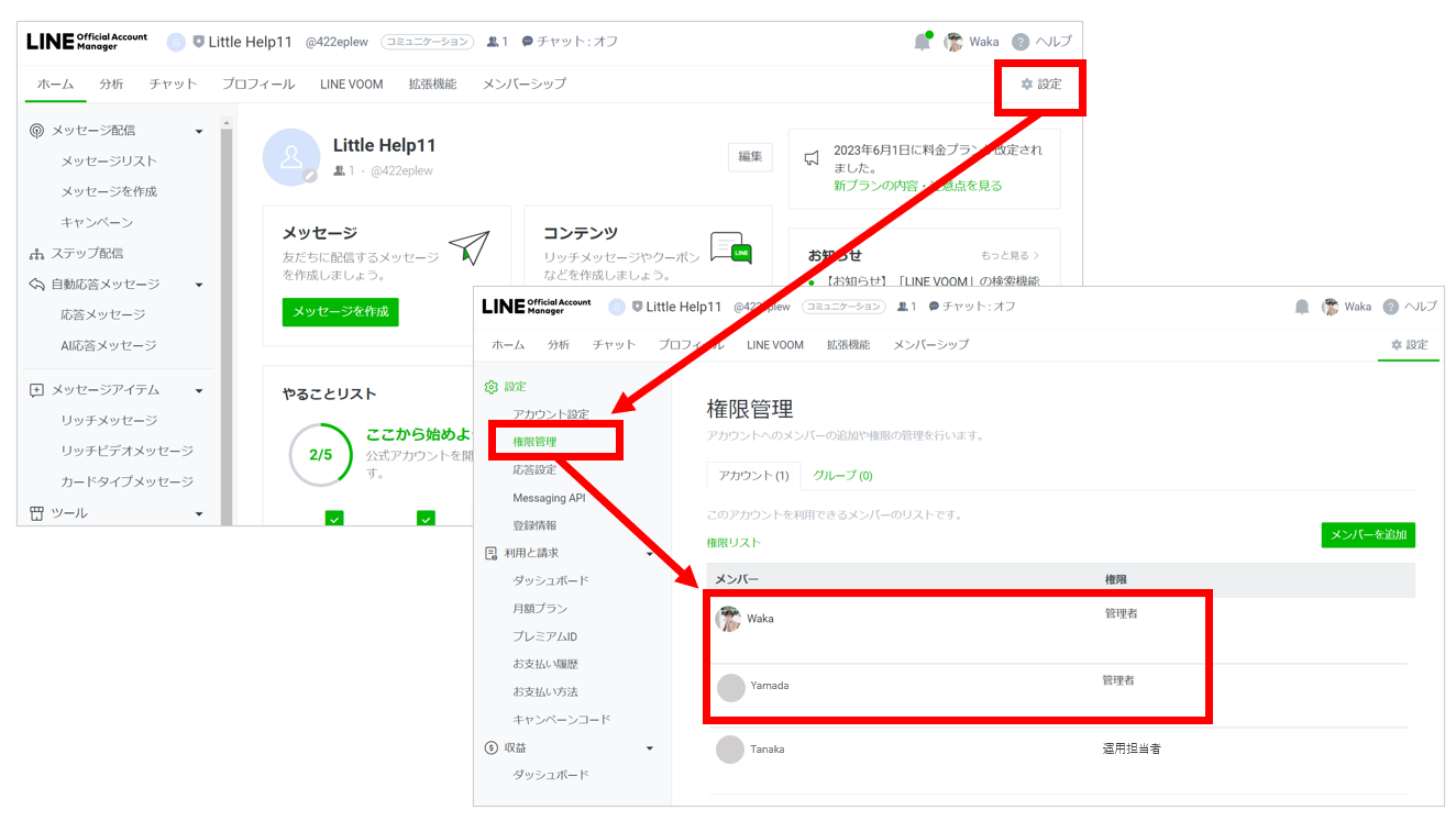 LINE Official Account Manager (https://www.linebiz.com/jp/manual/OfficialAccountManager/) にログインし、「設定>権限管理」を選択します。