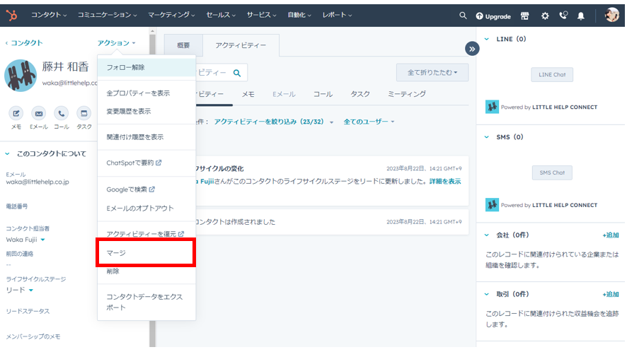 マージをする際は、必ずプライマリーとして管理したいメールアドレスを持ったコンタクトのページにアクセスし、「アクション>マージ」を選んでください。
