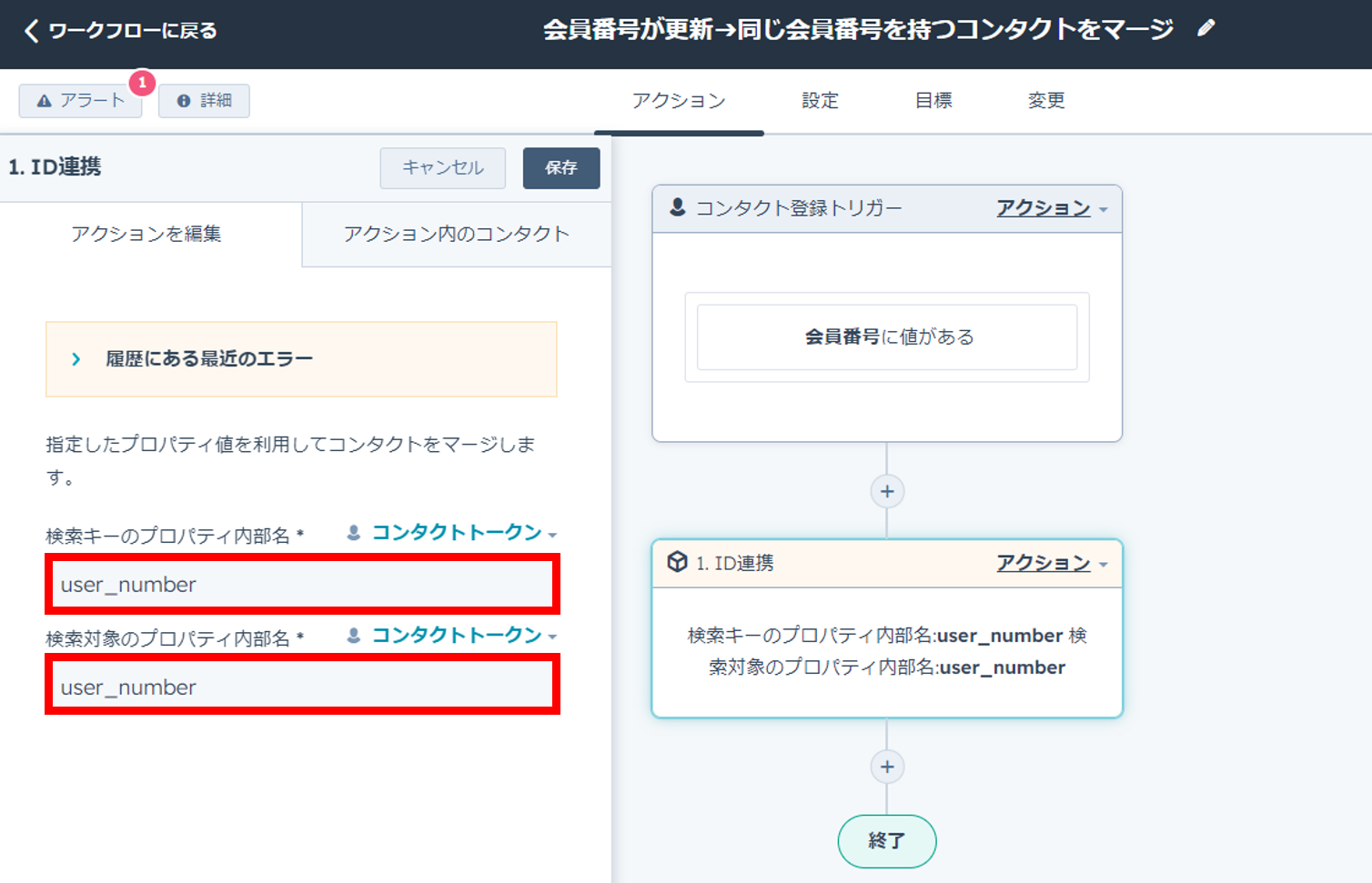 「ID連携」アクションは、「検索キーのプロパティ内部名」に入力された値が別のコンタクトの「検索対象のプロパティ内部名」と一致した時、2つコンタクトをマージさせる機能です。