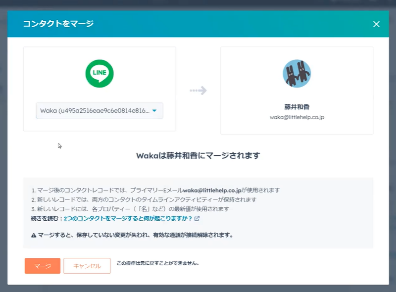 そのため、メールアドレスのドメインが「@line.me」のコンタクトレコードでマージを行った場合、「@line.me」がプライマリーのメールアドレスとして保存されます。ご注意ください。
