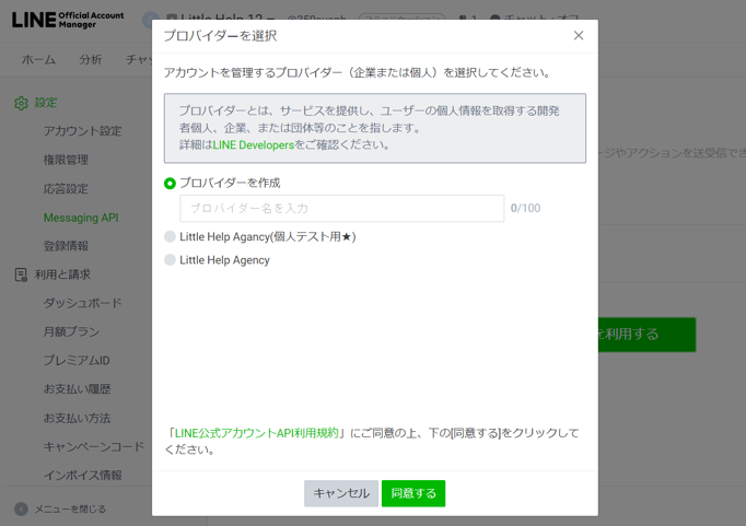ポップアップが出てくるので、LINE公式アカウントを管理するプロバイダーを選択します。
