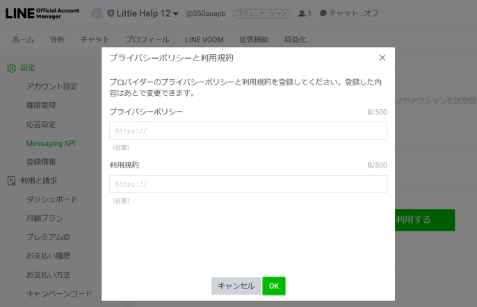 別のタブでLINE Account Managerにアクセスして「TOP>設定> Messaging API >Messaging APIを利用する」を選択します。
