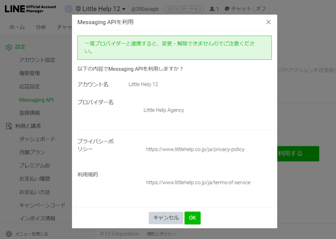 LITTLE HELP CONNECTに複数のLINE公式アカウントを接続する場合、本設定で選択するプロバイダーは全て同じものにすることを推奨します。