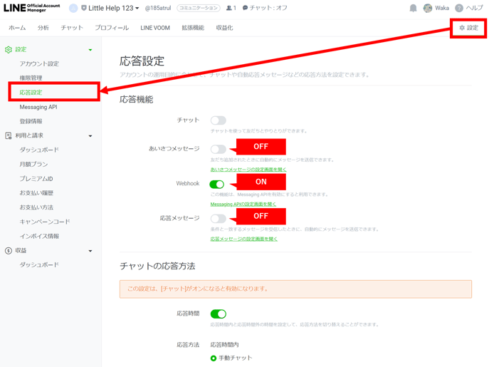 「あいさつメッセージ」はOFFに。「Webhook」はONに。「応答メッセージ」はOFFにします。「チャット」はONでもOFFでも問題ございません。