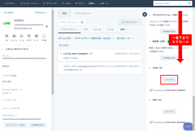 コンタクトページにアクセスし、右側メニューを下までスクロールするとLITTLE HELP CONNECTの連携メニューがでてきます。