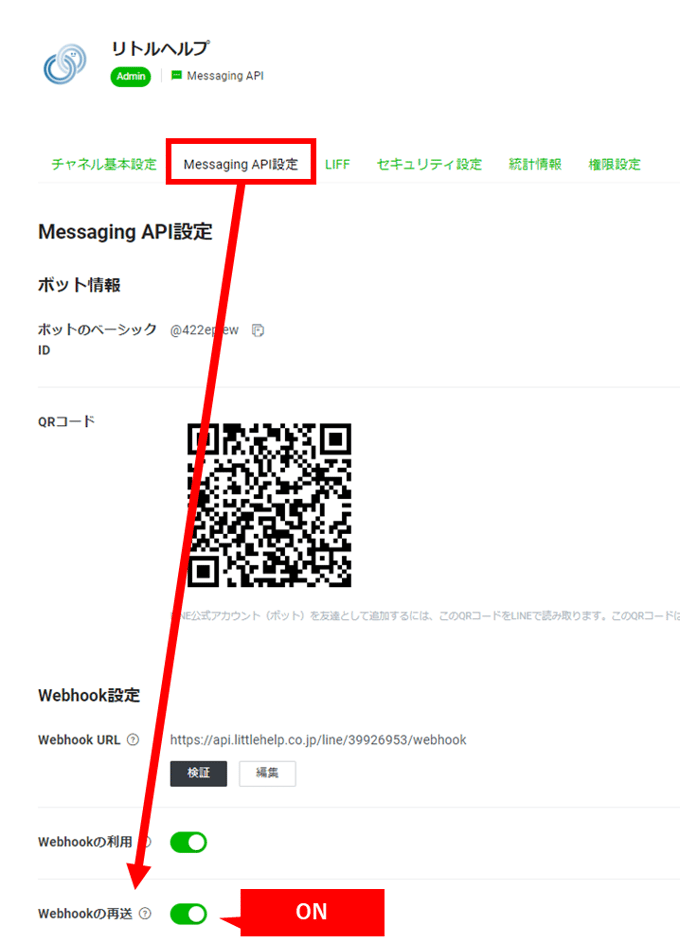 「3. Webhookの有効化」の設定に問題がない場合、「2. LINE公式アカウントの接続」が正しく設定できているかご確認ください。